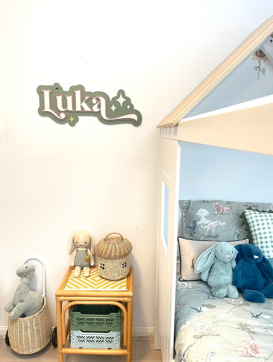 Custom Name Sign Detailed | Triple layered acrylic name plaque - Olive | Mocha | White | Stars